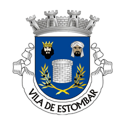 Escudo de azul, poço de prata, lavrado de negro, acompanhado em chefe, à dextra de uma cabeça de rei cristão, coroado de ouro e à sinistra, de uma cabeça de rei mouro com turbante e véu de prata, ambas as cabeças de sua carnação e em ponta de dois ramos de oliveira de ouro, frutados de negro, com os pés passados em aspa. Coroa mural de prata de quatros torres. Listel branco com a legenda a negro: Vila de Estombar.